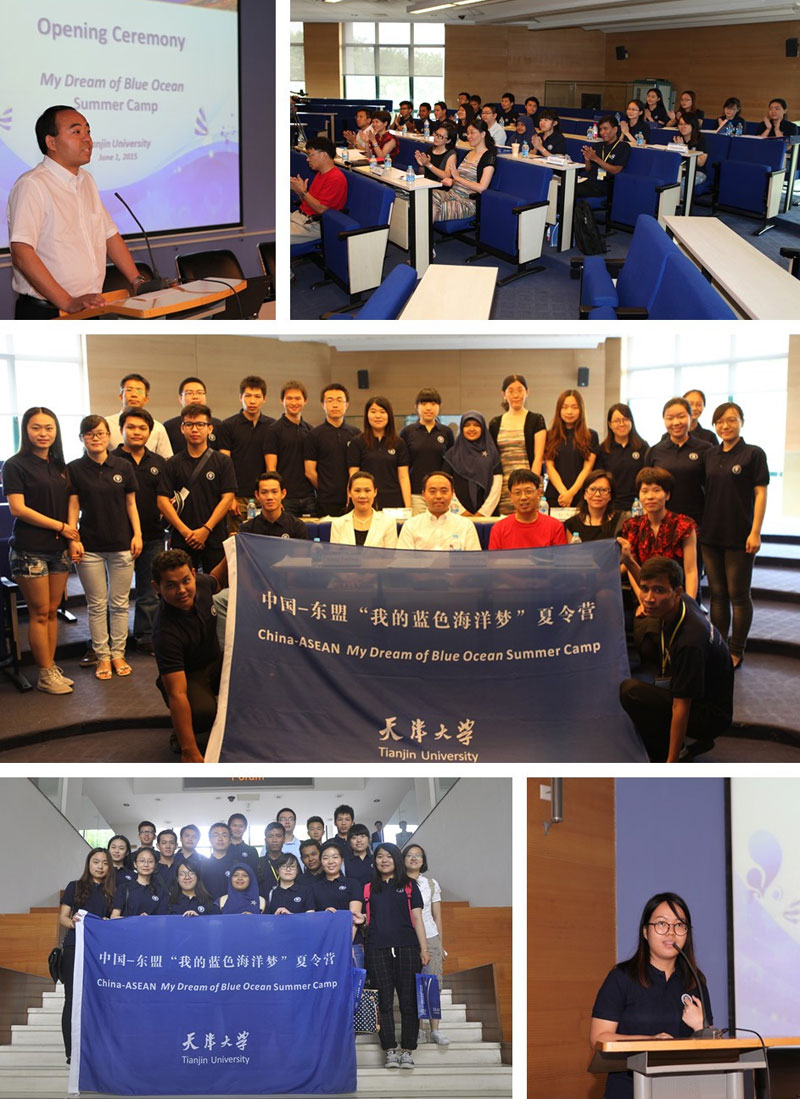 On June 1, 2015, the opening ceremony of the China - ASEAN My Dream of the Blue Ocean Summer Camp was held at Tianjin University. There were some twenty students from Universities across China and the ASEAN nations. In addition to the students and volunteers, Professor Hu Wenping, Assistant to the President, Professor Yang Fuling, the Director of the Office of International Cooperation, Professor Wang Guangyi, the Assistant Dean of the School of Environment Science and Engineering and representatives from the School of Environment Science and Engineering, and the Office of International Cooperation attended the ceremony and summer camp.